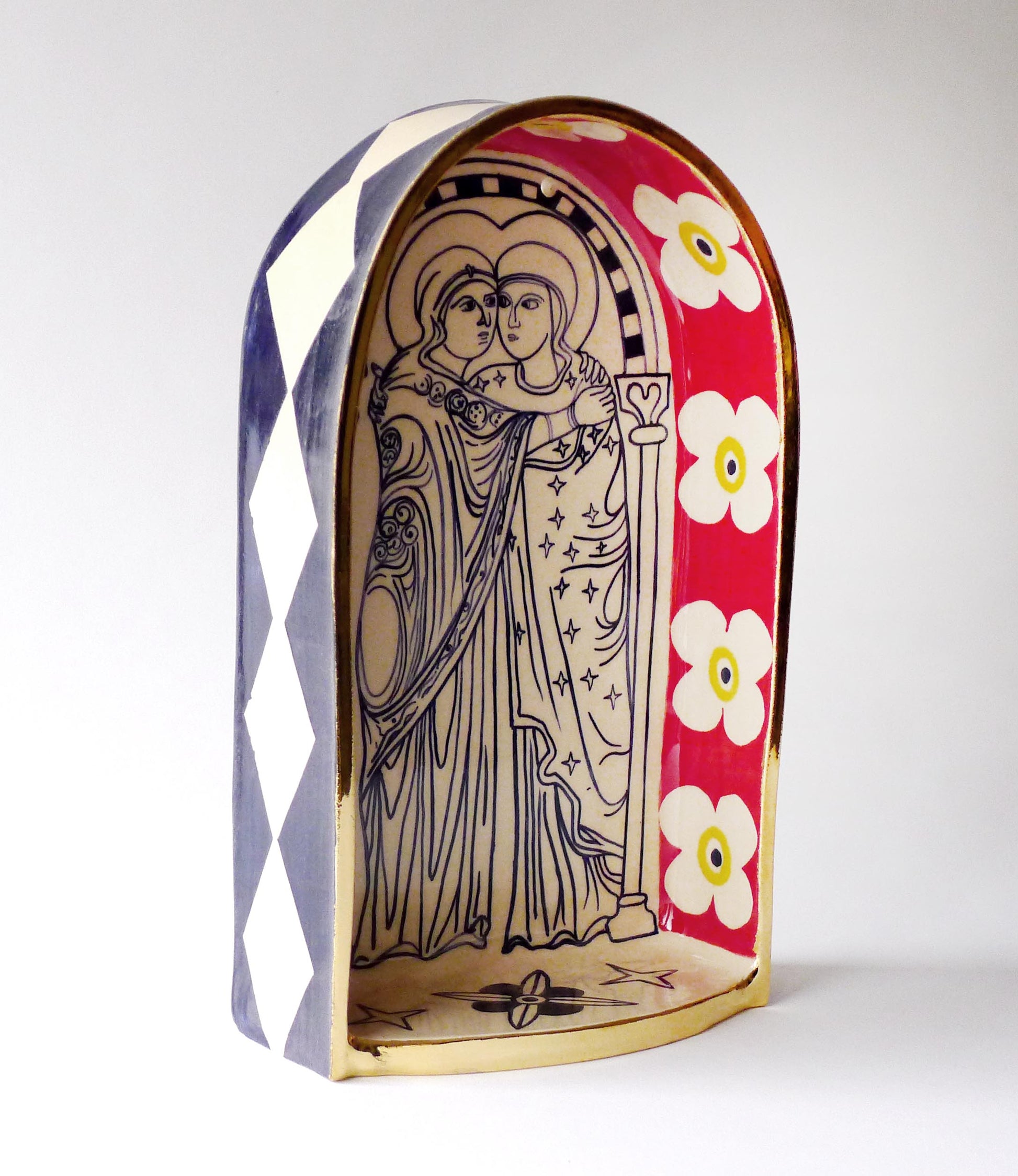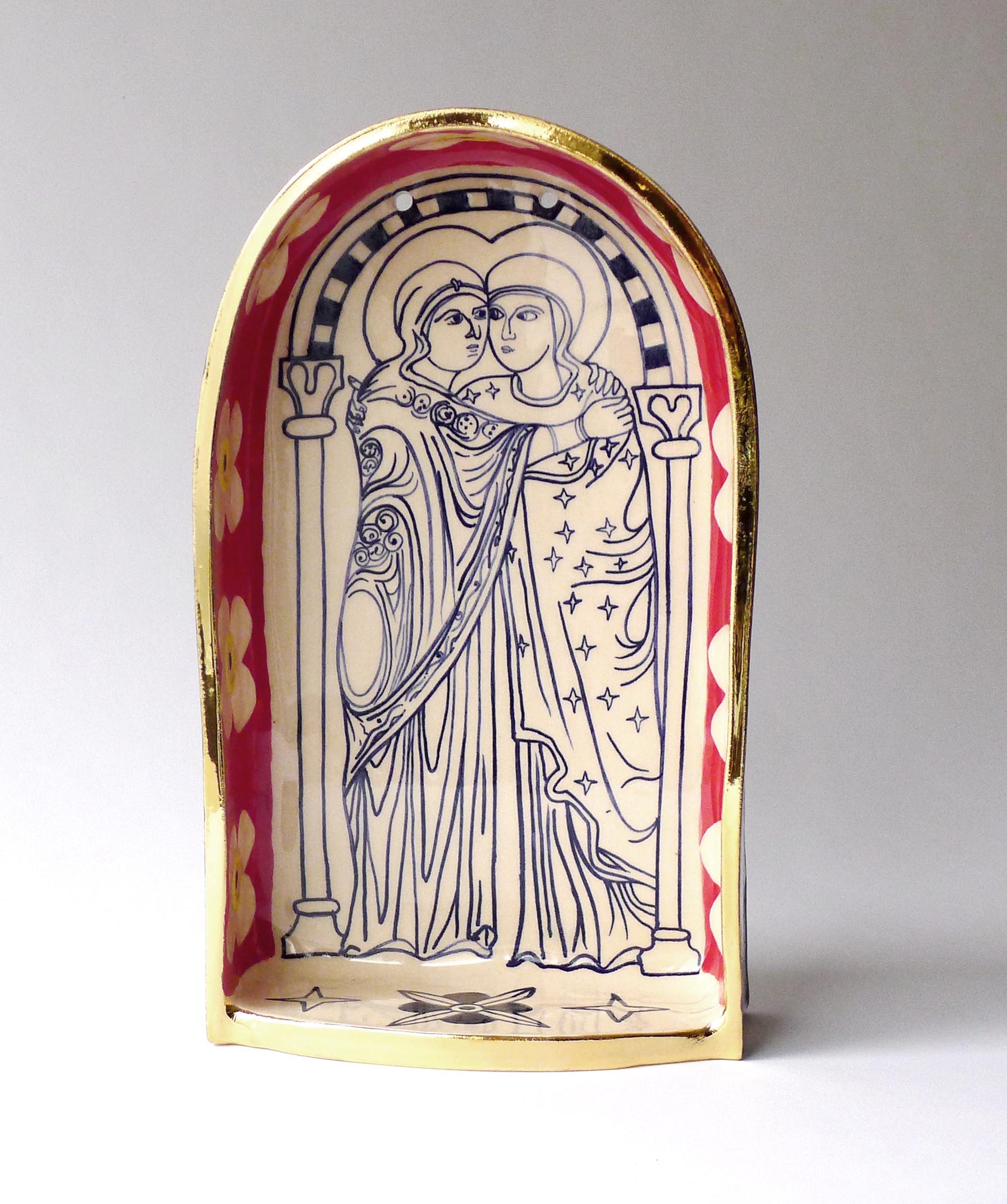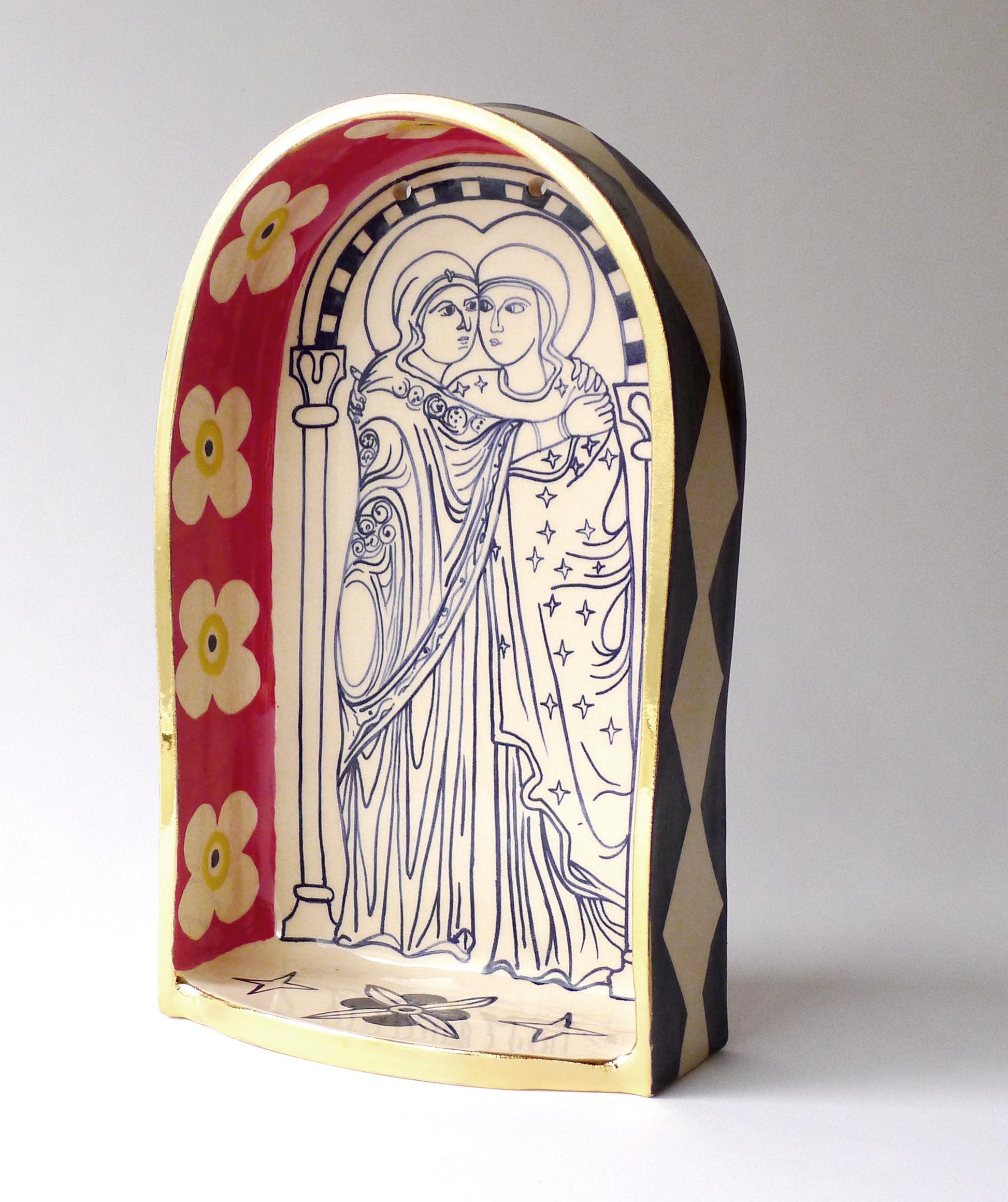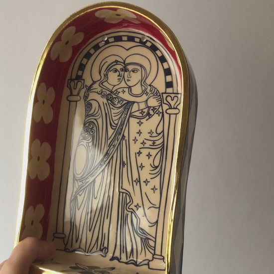 Esta pieza se inspira en la tradición iconográfica conocida como La Visitación. Representa el momento en que la Virgen María visita a su prima Isabel para celebrar su embarazo y expresar, mediante ese gesto de ayuda, su disposición a servir. Este abrazo constituye un testimonio medieval que da cuenta de la hermandad entre mujeres desde la antigüedad.