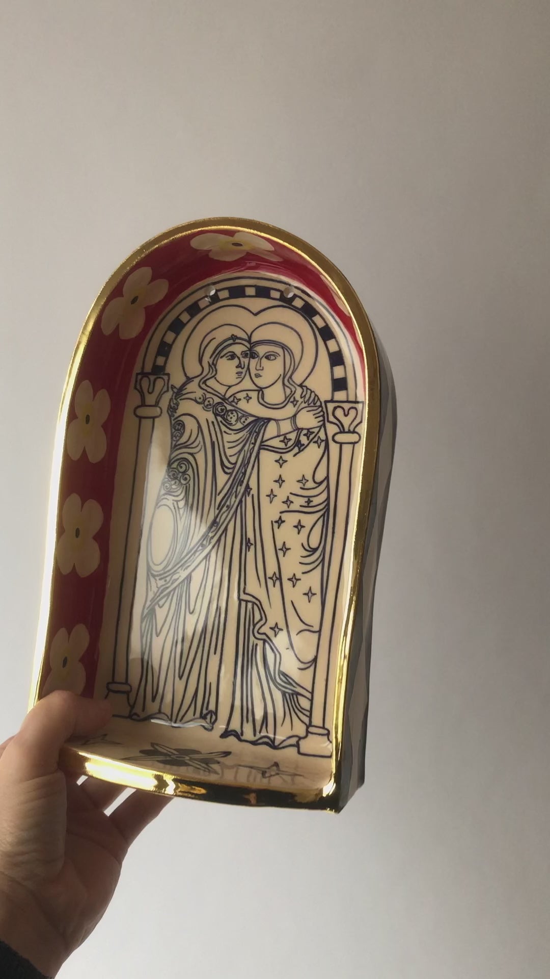 Esta pieza está hecha íntegramente a mano por el artista con arcilla blanca natural y ha sido cocida tres veces en un horno de cerámica a una temperatura de entre 900 y 1100 grados Celsius. En la primera cocción (biscú), se asientan los pigmentos cerámicos y, en la segunda, se aplica una capa de esmalte transparente para lograr un acabado brillante e impermeable. Finalmente, la pieza se embellece con lustre cerámico dorado (con partículas de oro auténtico), obtenido en una tercera cocción a 750 grados Celsius.