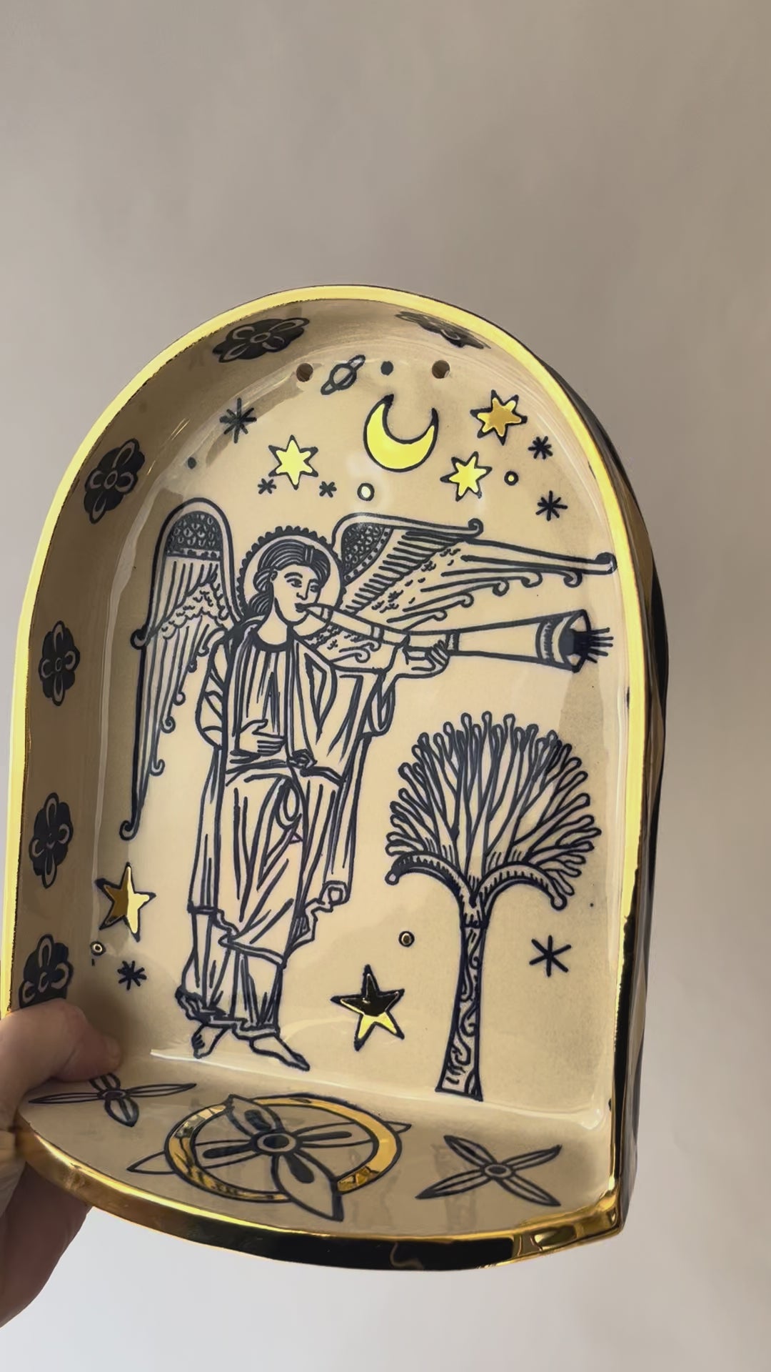 This piece is entirely handmade by the artist using natural white clay and has been fired three times in a ceramic kiln at a temperature of between 900 and 1100 Celsius degrees. In the first firing (bisque) the ceramic pigments are settled and it is in the second firing that a layer of transparent glaze is applied, to achieve a shiny and waterproof finish. Finally, the piece is embellished with gold ceramic luster (which has real gold particles in it) obtained on a third fire at 750 Celsius degrees.