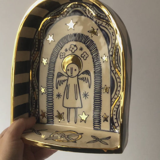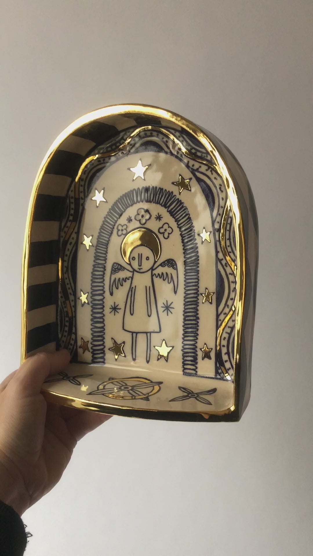 This piece is entirely handmade by the artist using natural white clay and has been fired three times in a ceramic kiln at a temperature of between 900 and 1100 Celsius degrees. In the first firing (bisque) the ceramic pigments are settled and it is in the second firing that a layer of transparent glaze is applied, to achieve a shiny and waterproof finish. Finally, the piece is embellished with gold ceramic luster (which has real gold particles in it) obtained on a third fire at 750 Celsius degrees.