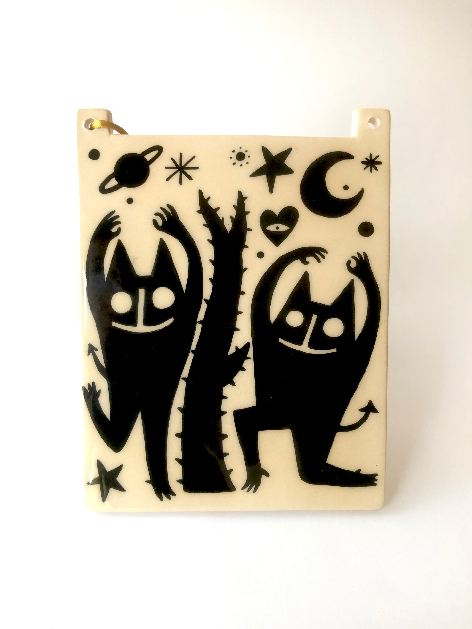 The Limia Crafts project is created by the artist Elara Elvira. Each of these pieces is handmade from natural white clay and is fired two or three times in a ceramic kiln at a temperature of between 900 and 1100 degrees. In the first firing (bisque) the ceramic pigments are settled and it is in the second firing that a layer of transparent glaze is applied, to achieve a shiny and waterproof finish. It can be used for wall hanging inside the house or outdoors in the garden.